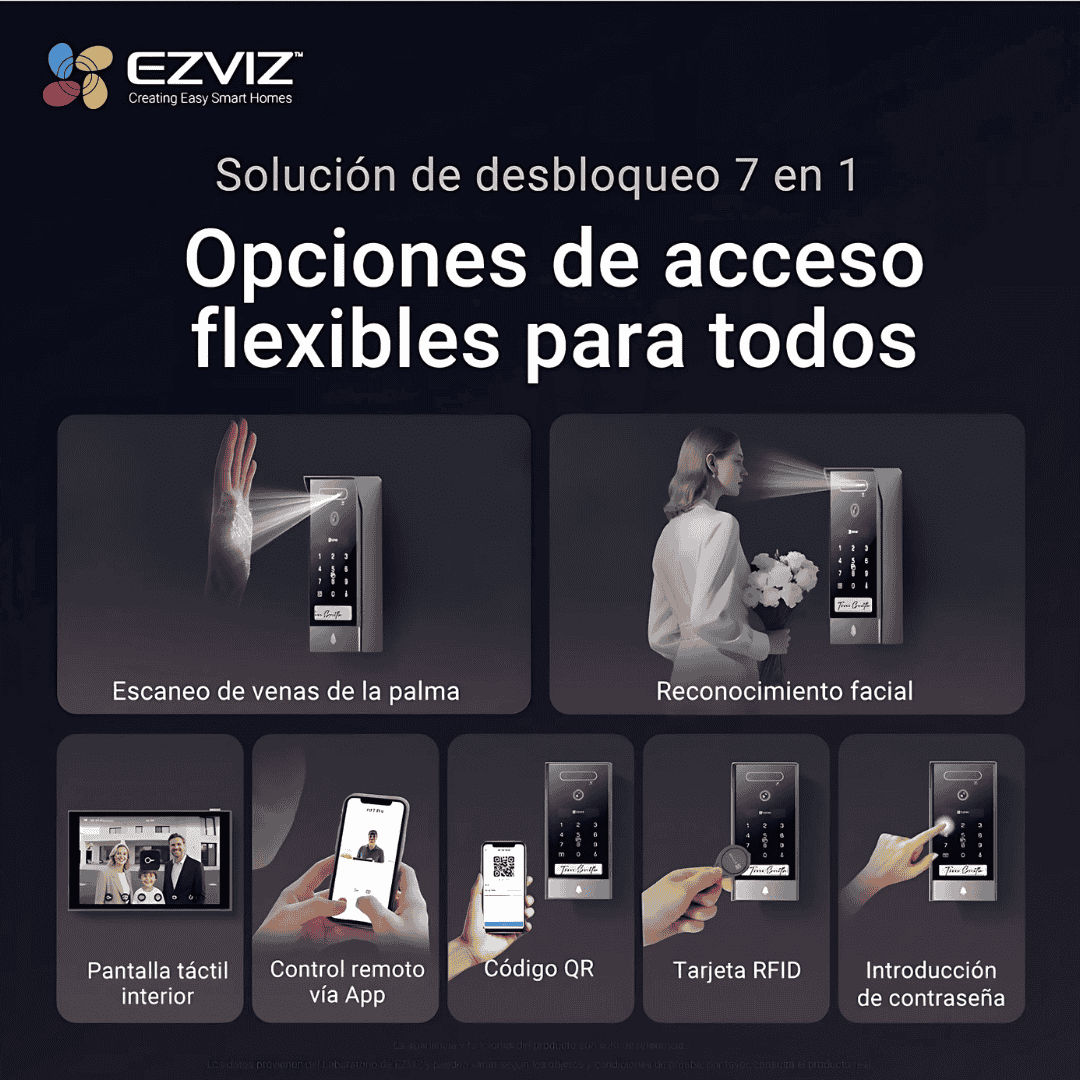 | Funciones de seguridad | Desbloqueo por reconocimiento facial, venas de la palma, tarjeta RFID (3 tarjetas CPU incluidas), contraseña, QR, app móvil o monitor interior |