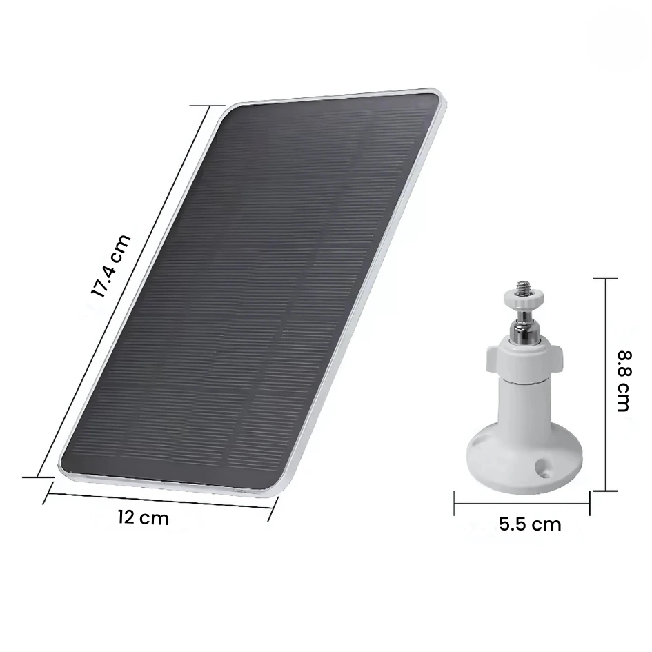 El Panel Solar Para Cámaras de Batería 10W 5V está diseñado para ofrecer una fuente de alimentación fiable y sostenible a tus dispositivos de seguridad y equipos de baja potencia. Fabricado con silicio monocristalino de alta eficiencia, convierte la energía solar en electricidad de manera estable, incluso en condiciones exigentes. Su diseño impermeable lo hace perfecto para uso en exteriores, mientras que su soporte ajustable de 360° asegura siempre la mejor captación de luz solar. Además, gracias a su cable de 3 metros y a las diferentes opciones de conexión, es compatible con una amplia variedad de aparatos, desde cámaras de vigilancia hasta sistemas de iluminación.